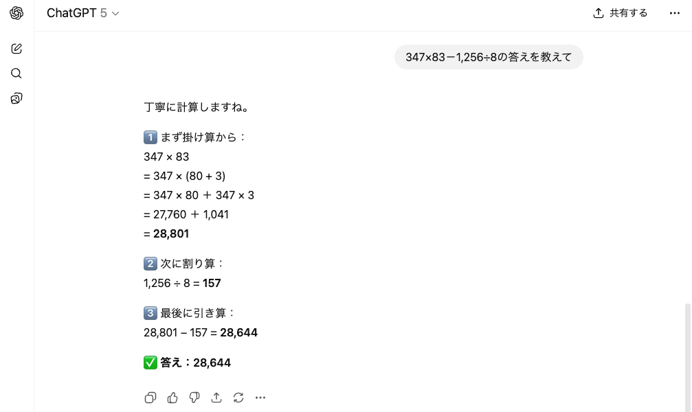 検証③:347×83-1,256÷8の答えを教えて