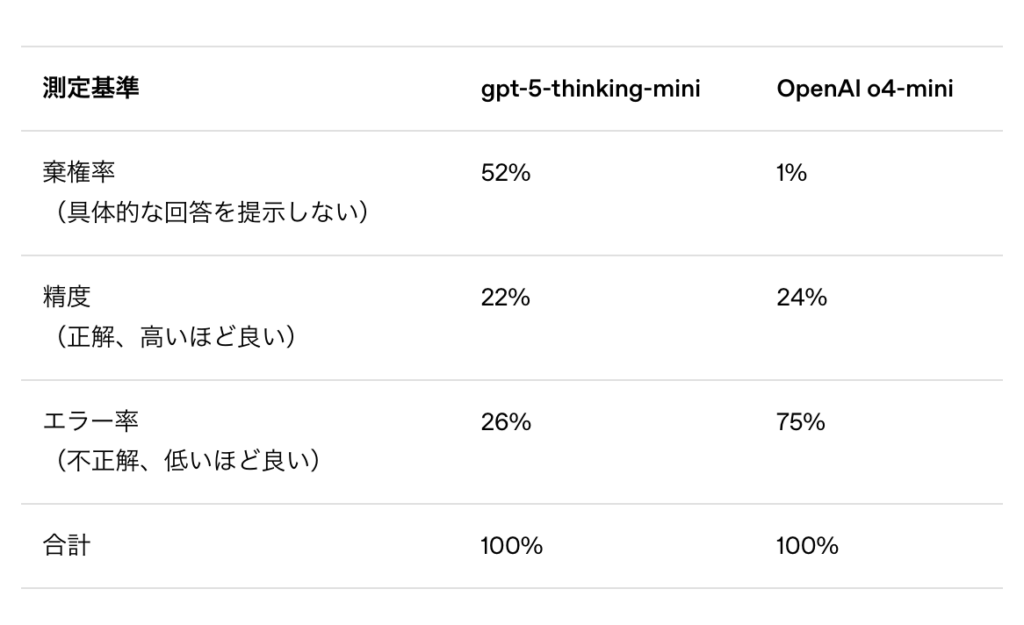 OpenAIの内部テストでもこの傾向が確認されています。たとえば、古いモデル(OpenAI o4-mini)は正答率がわずかに高くても、エラー率(ハルシネーション率)が75%に達していました。一方で、GPT-5は誤答を減らし、「わからない」と棄権する割合を増やす方向に進化しています。