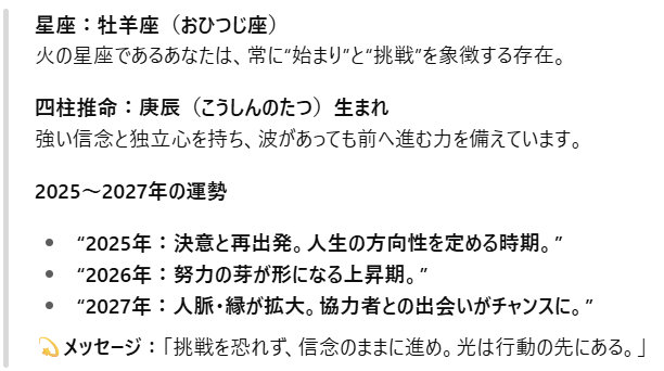 以下では、実際の占いプロンプト例と、ChatGPTが返した占い結果(2000年4月1日生まれの場合)を掲載しています。