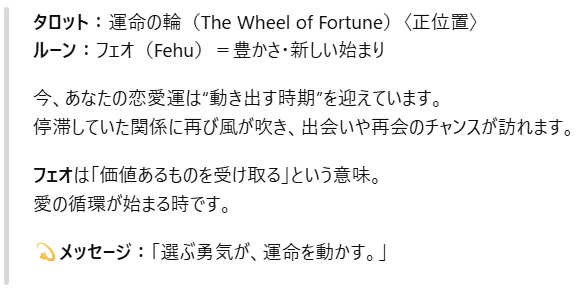2000年4月1日生まれの私の恋愛の流れを、 タロットとルーン占いを組み合わせて占ってください。 カードとルーンの意味を合わせてアドバイスを教えてください。