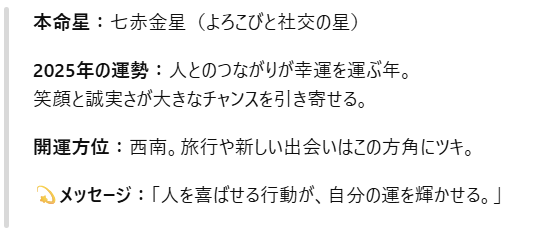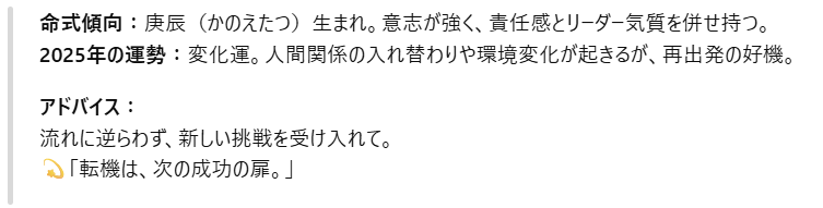 ChatGPTは生まれた日付だけでも擬似的に命式を再現し、性格傾向や運の流れを自然に解釈してくれます。