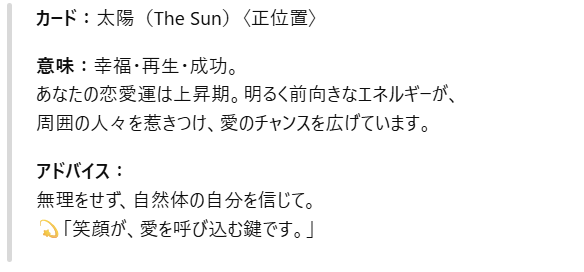 ChatGPTはカードの意味を理解しているため、本物のリーディングのような鑑定を再現できます。