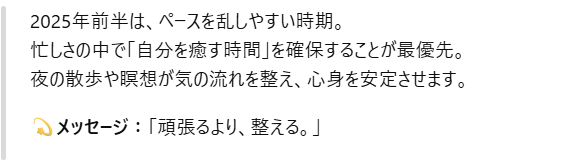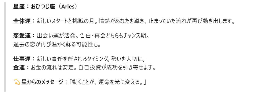 タロットや星座に限らず、「今日の気分」や「モヤモヤしたテーマ」を入力するだけでも、ChatGPTはあなたにぴったりのメッセージを導き出してくれます。