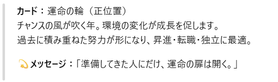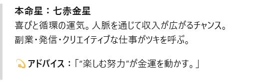 「今期の運勢」「恋愛傾向」「金運サイクル」など、幅広く応用可能です。