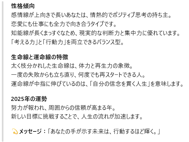 この画像の手のひらを手相占いとして鑑定してください。 生命線・感情線・知能線・運命線・結婚線の位置と形を分析し、 私の性格と2025年の運勢を教えてください。