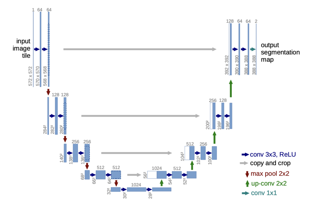 U-Netは前述の通りエンコーダとデコーダから成る、画像のピクセル(画素)1つひとつに対してラベル付けしていく手法のモデルです。