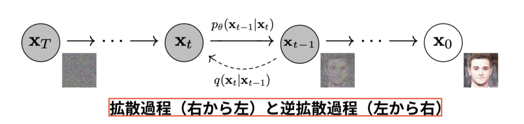 「ノイズだらけにしてどうすんの?」って思いますよね。でもこの拡散モデルが重要なのです。