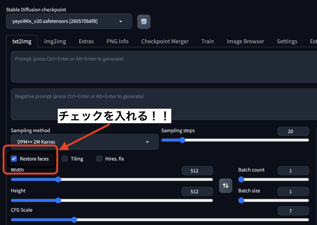Restore faceにチェックを入れることで顔の補正を重点的に行ってくれます。