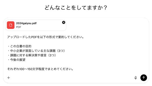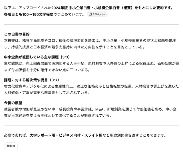 ここでは、中小企業庁が発行する「2024年版 中小企業白書 概要」を例に、実際のプロンプトを紹介します。