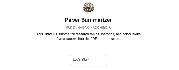 Paper Summarizerは、論文の要点を素早く抽出することに特化したGPTsです。研究目的、手法、主な発見、結論といった重要ポイントを短時間で把握できます。