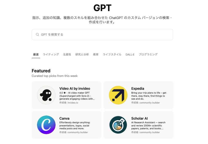 GPTsは以下のページの検索窓から、該当するGPTsを検索することによってアクセスすることが可能です。