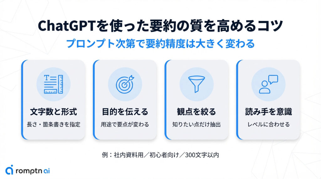 - 要約の精度を高めるには、プロンプトで「文字数」「出力形式」「要約の目的」「読み手のレベル」を具体的に指定することが重要