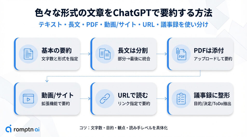 - ChatGPTはテキストだけでなく、PDF・Word・YouTube動画・Webサイトなど多様な形式の文章を要約できる