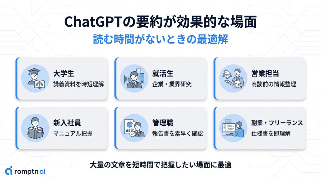 ChatGPTの要約機能は、さまざまなビジネスシーンや学習場面で活用できます。ここでは、特に効果を発揮する代表的な場面を紹介します。