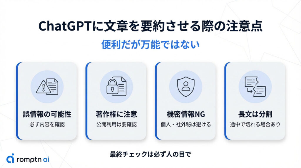ChatGPTに文章の要約をしてもらう際には、以下の点に注意する必要があります。