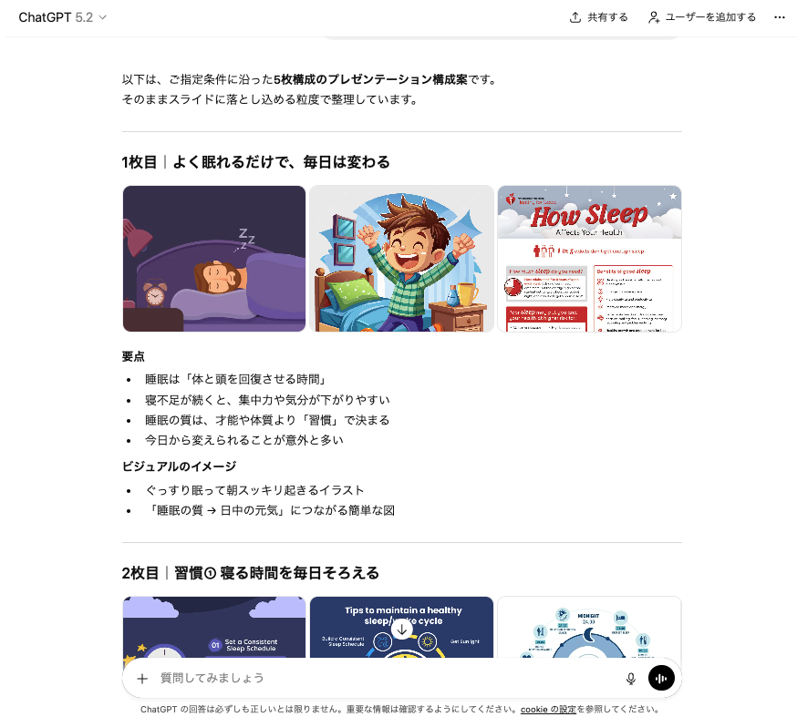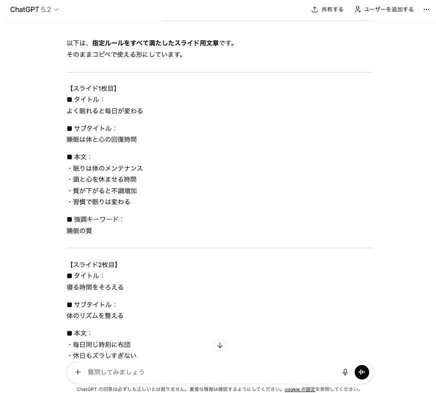まず構成案だけを作成し、内容を確認してから「2枚目のスライドをもう少し詳しく」「4枚目に事例を追加して」と指示していけば、理想に近い資料へ段階的に改善できます。ChatGPTは対話を通じて学習するため、やり取りを重ねるほど意図を汲み取った提案をしてくれるようになります。