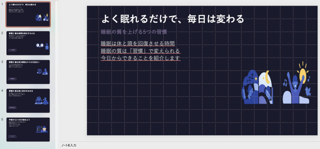 ・5枚目のまとめスライドには「今夜やってみよう」という行動を促すメッセージを入れる