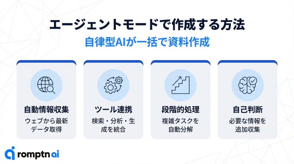 明日のプレゼンまでに資料を完成させたい、今日中に提案書を作らなければならないといった緊急時には、エージェントモードが最適です。