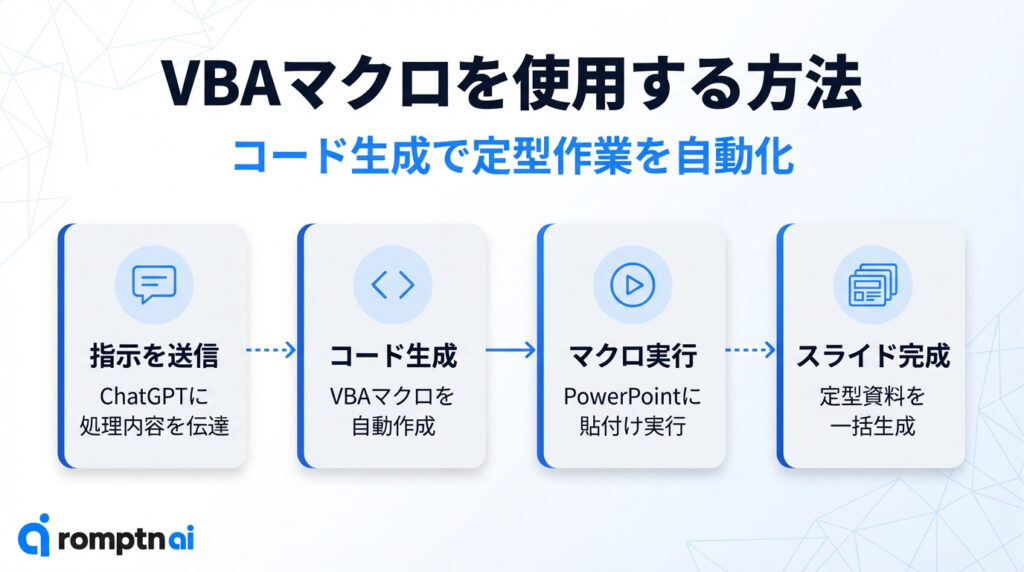 一度ChatGPTにマクロコードを生成してもらえば、それを保存しておくことでワンクリックで同じ形式のスライドを量産できます。数値やテキストだけを差し替えれば完成するため、定型業務の大幅な時短につながります。