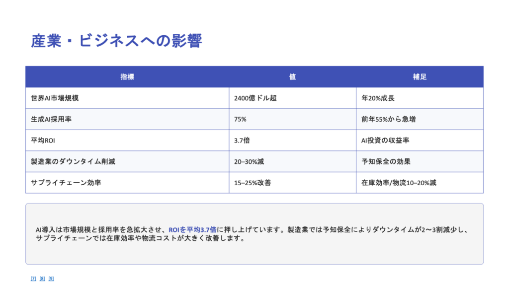 AIが作る資料は情報の正確性やデザインの細部で調整が必要な場合があります。生成されたファイルをPowerPointで開いたら、フォントサイズ、配色、画像の配置、表現の微調整などを行いましょう。特にビジネスの重要な場面で使う資料は、数値データの確認、企業ロゴやブランドカラーの反映、スピーカーノートの追加など、最終チェックを必ず行ってください。