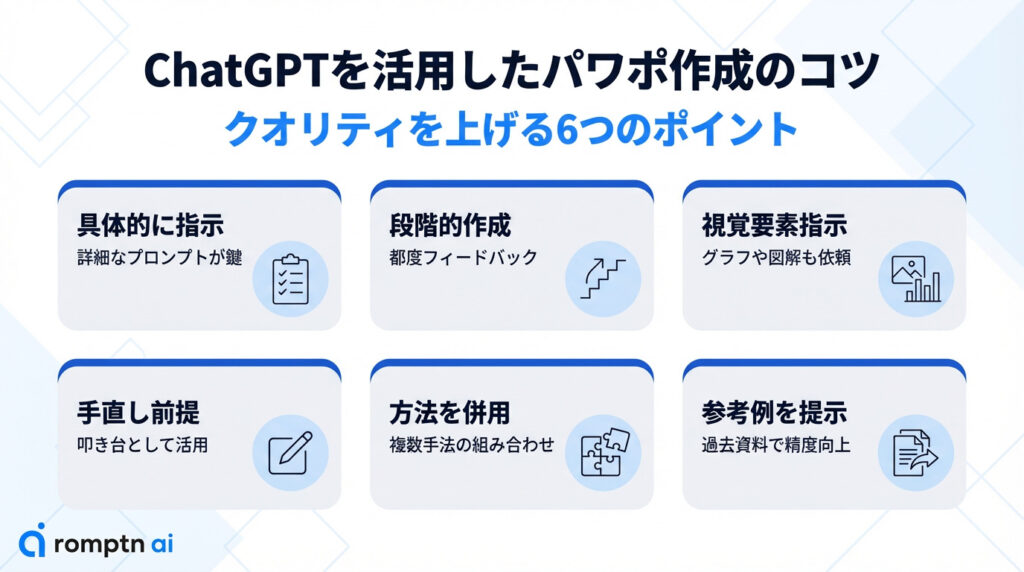 ここでは、ChatGPTを使って効率的にパワーポイントを作成する基本的な方法を、実践的なプロンプト例とともに解説します。