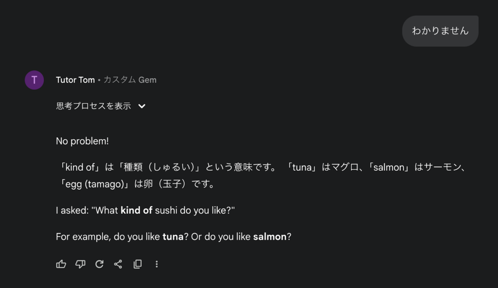 わからない場合は「わかりません」と入力することで、Gemが解説してくれます。