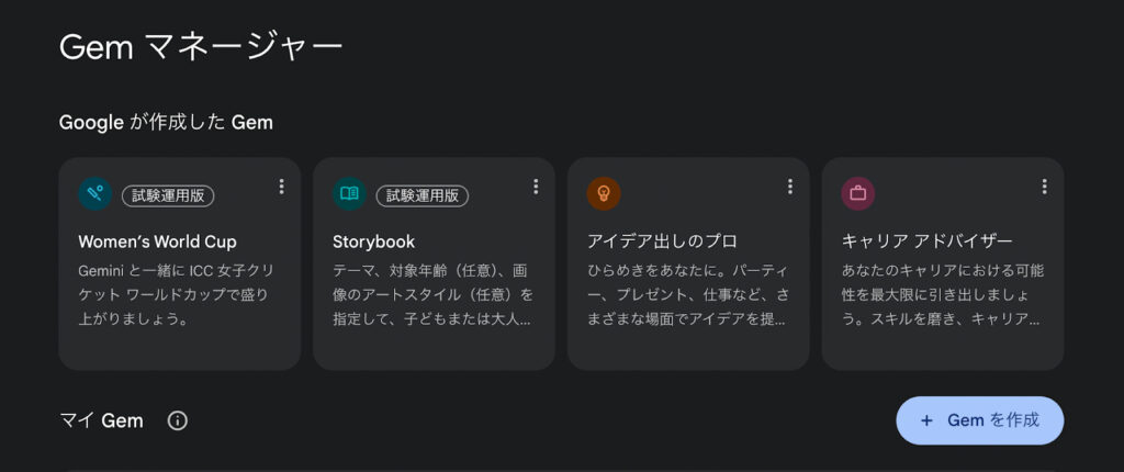 これをクリックすると、Gemを新しく作成するための専用画面(Gemマネージャー)が表示されます。