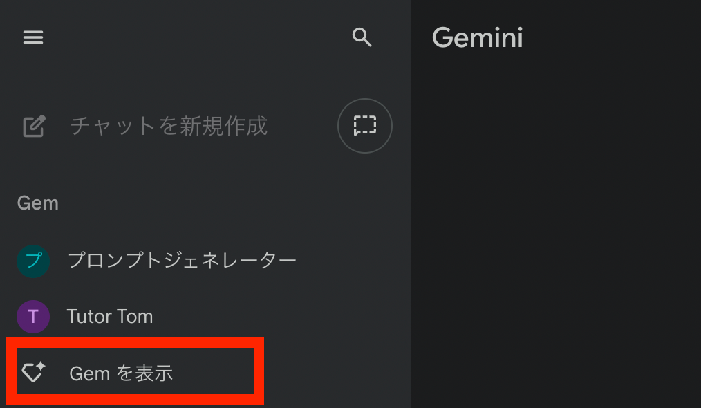 画面左側にあるメニューバー(サイドバー)から「Gemを表示」をクリックします。