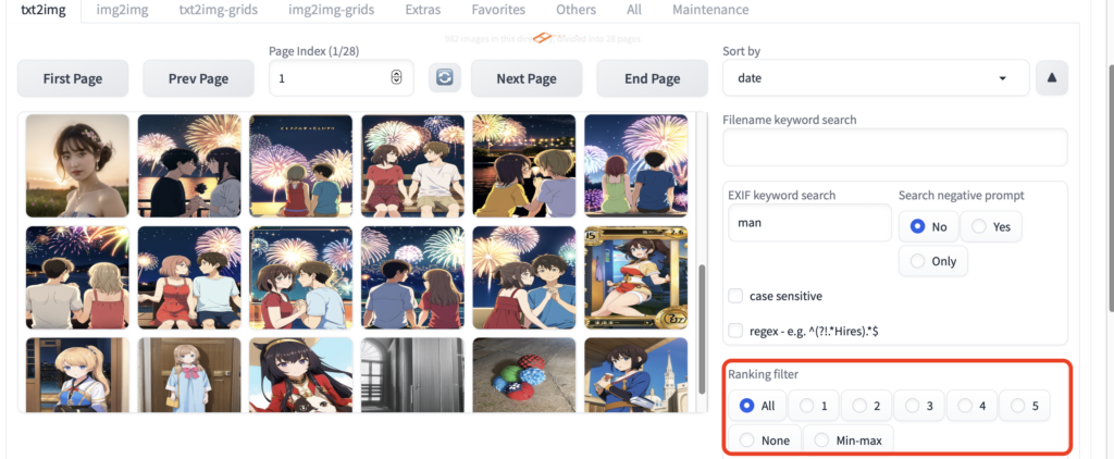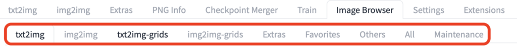 「Image Browser」は、過去に生成された写真を閲覧するための画像ブラウザで、生成された情報を表示し、txt2imgまたはimg2imgにプロンプトを送信し、「お気に入り」の画像を収集し、不要になった画像を削除し、任意の仕分けで画像を閲覧することもできます。