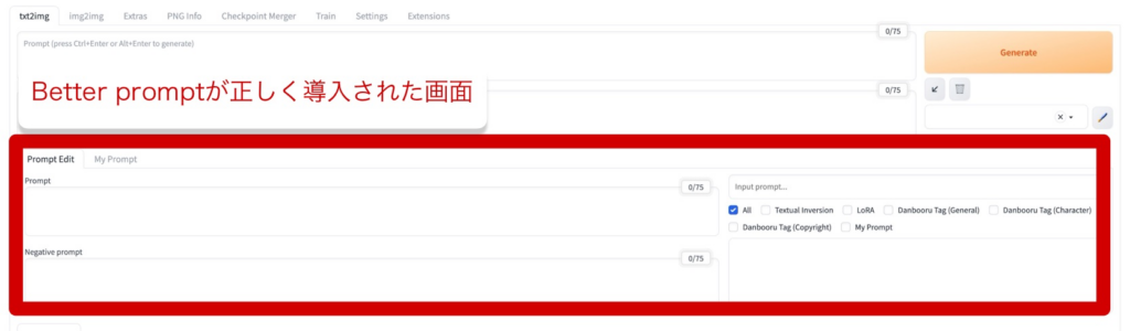 7、「Better Prompt」が正常にインストールされた場合は、画像の赤枠の項目が追加されています。