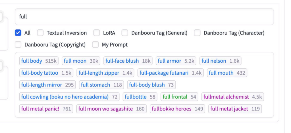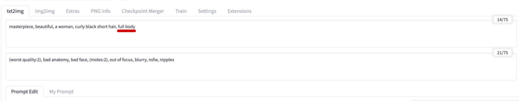 その中から、「full body」をクリックすると、通常の呪文(プロンプト)入力欄に追加されます。