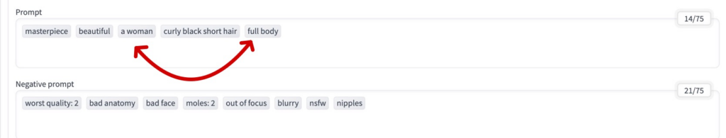 - 呪文(プロンプト)の順番変更:マウスを使って、呪文(プロンプト)の順番を好きなように変えることができます。