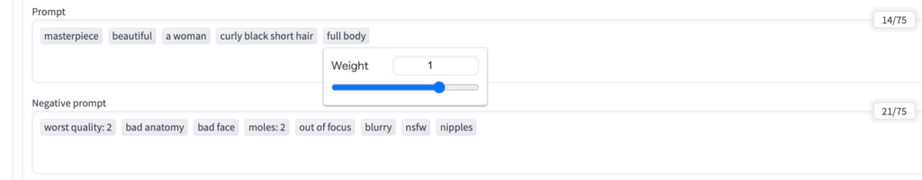 最後に、呪文(プロンプト)の重みを変更したいときは、ブロックにカーソルを置いて右クリックすると変更が可能です。