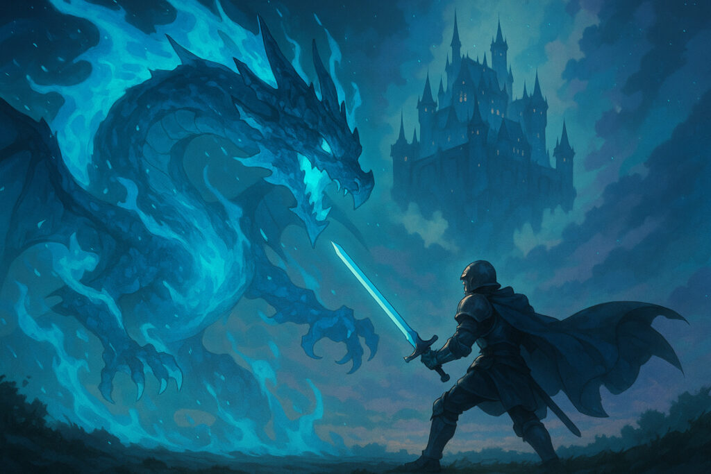 空に浮かぶ巨大な城を背景に、青い炎をまとったドラゴンと剣を構える騎士が対峙している。幻想的な光に包まれたアニメ風のイラスト
