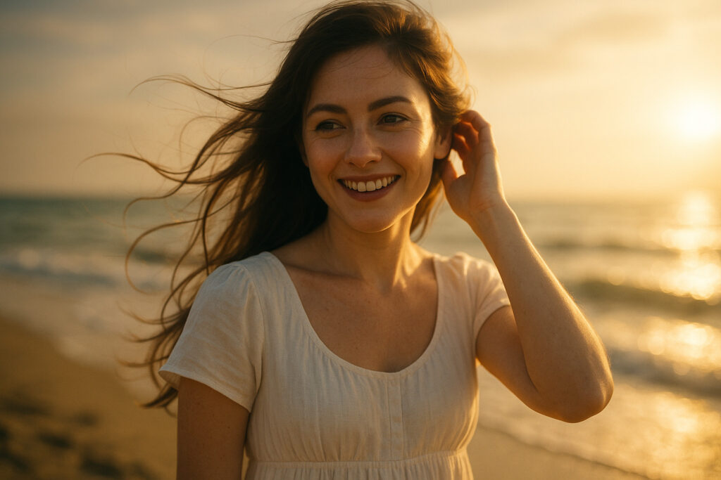 白いワンピースを着た若い女性が、海辺で風になびく髪を手で押さえて微笑んでいる。逆光でドラマチックな光が差し込み、映画風のポートレート
