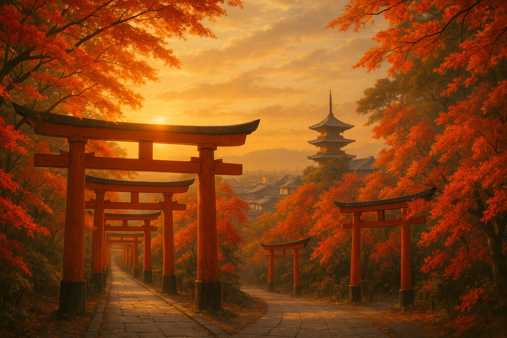 夕暮れ時の京都の街並み、朱色の鳥居が並ぶ参道、秋の紅葉が鮮やかに彩る景色、柔らかな光が差し込むシネマティックな雰囲気