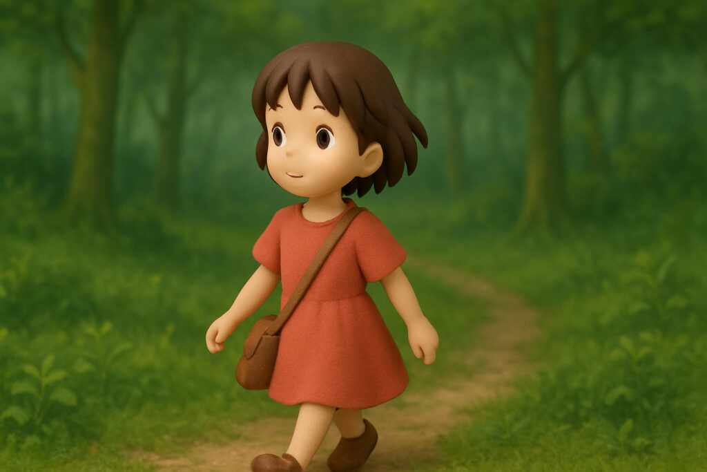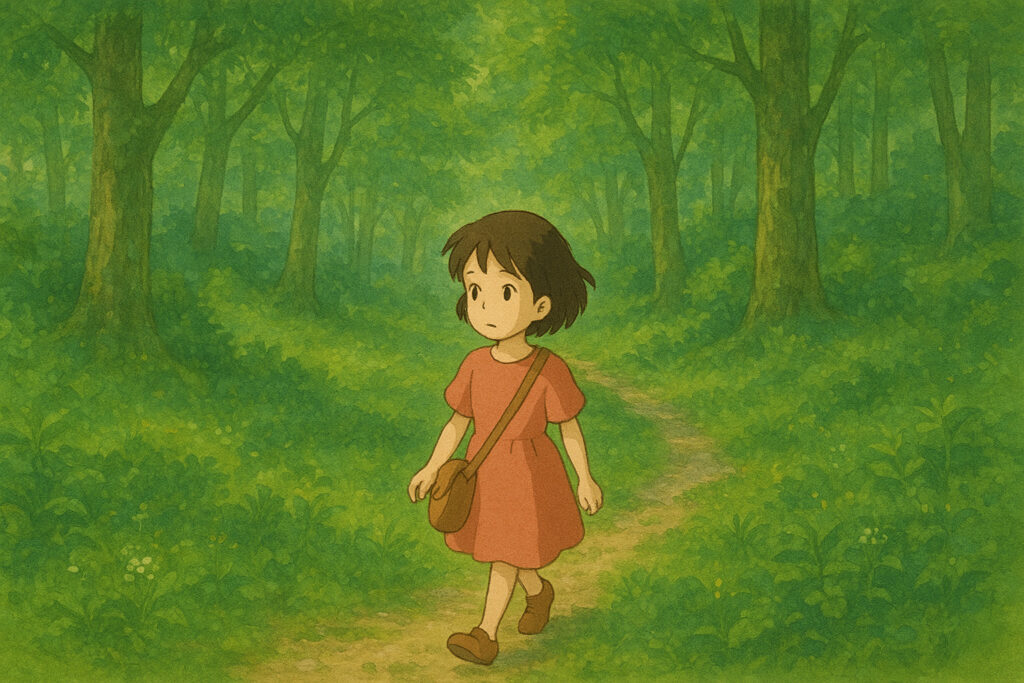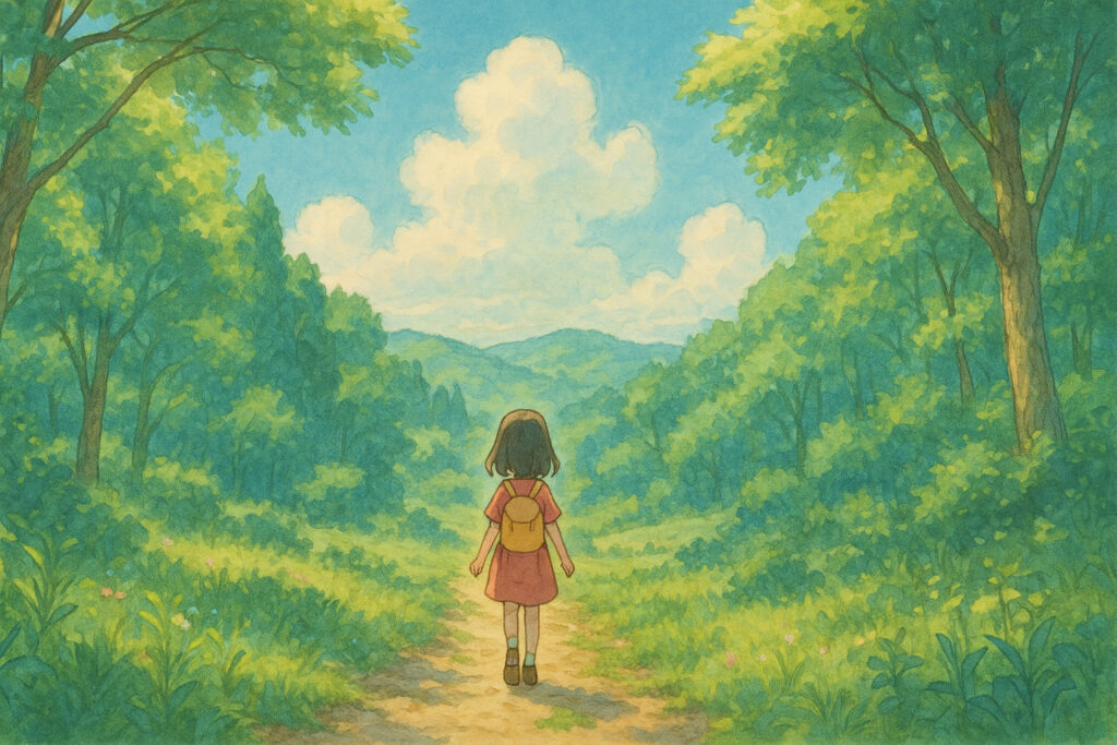 手描きアニメーションのスタイル, 日本の田舎の風景, 美しい森, 小さな女の子が歩いている後ろ姿, 青い空, 白い雲, 柔らかな日差し, パステルカラー, 詳細な背景, 広角ショット, 奥行きのある構図, 夢のような雰囲気