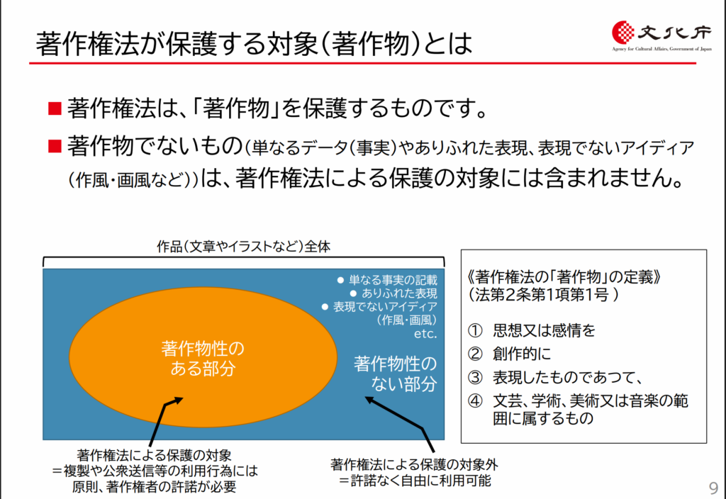 著作権法は、アイデアや画風ではなく、具体的な表現を保護の対象としています。そのため、キャラクターの特徴や独自の構図などを「表現上の本質的な特徴」として保護しているといえます。