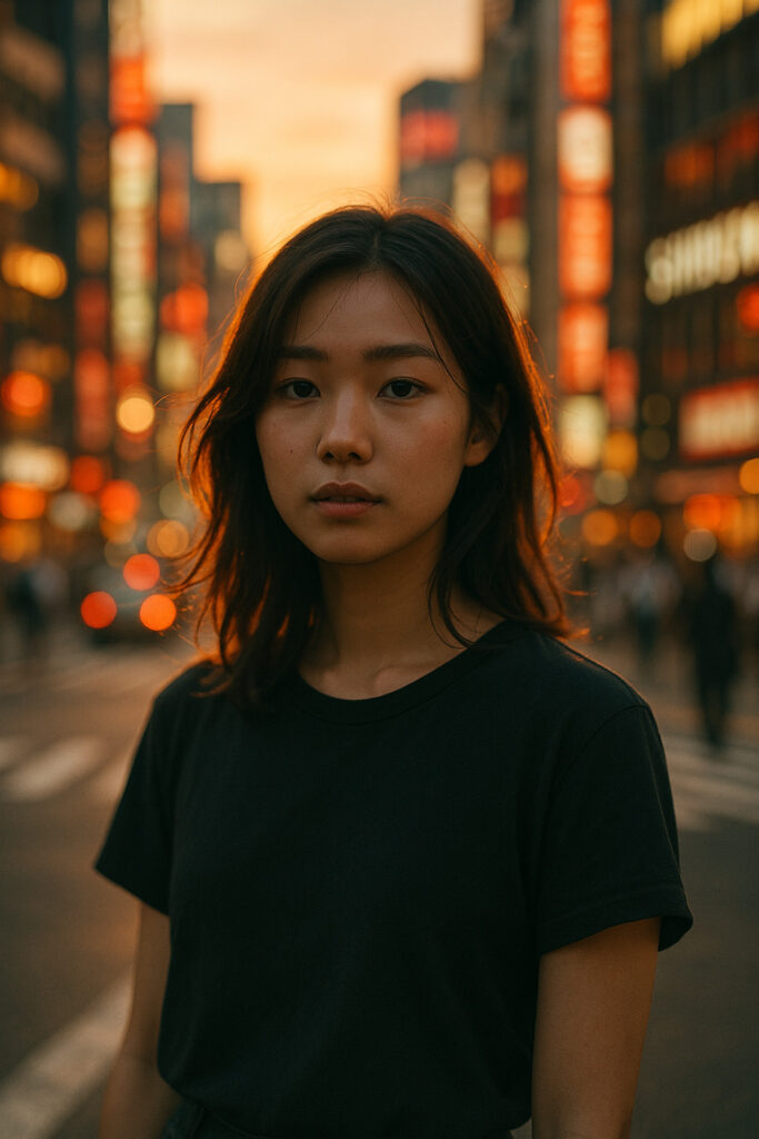 A photorealistic portrait of a young woman standing in the streets of Shibuya at sunset, soft rim light, 85mm portrait lens, shallow depth of field, natural skin tone, cinematic color grading, warm lighting.