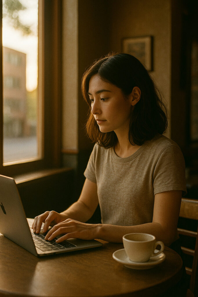 A realistic photo of a woman working on a laptop in a cozy cafe, golden hour sunlight through window, 50mm lens, film grain, true-to-color.