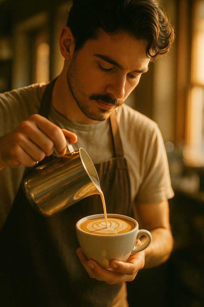 A photorealistic barista pouring latte art in a sunlit cafe, close-up, 50mm prime, soft rim light, film grain, warm color grading.