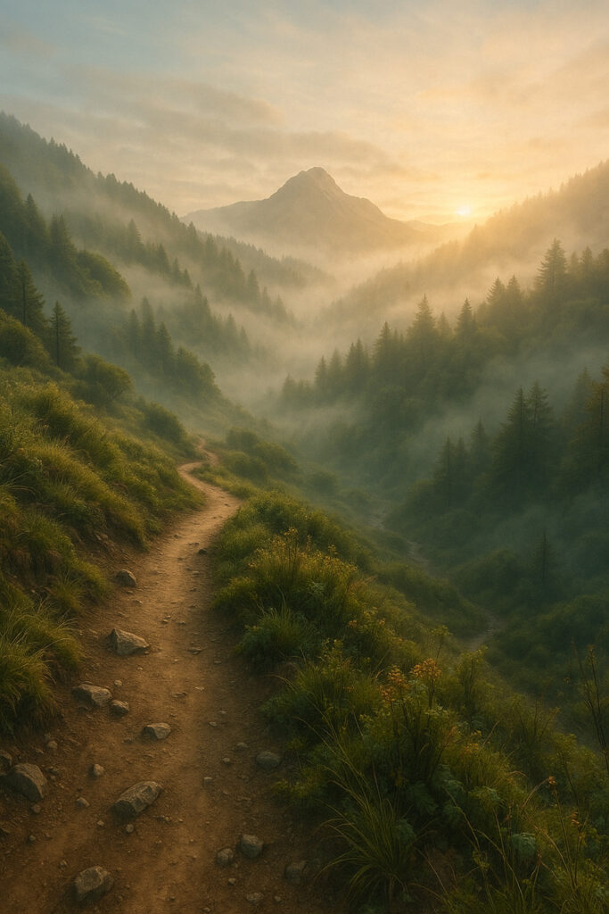 A photorealistic view of a mountain trail covered in morning fog, soft sunlight, wide-angle 16mm lens, depth of field, HDR detail, cinematic tone
