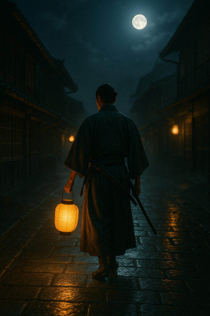 A Taisho-era samurai walking on a wet stone street at night, lantern light and moonlight rim lighting, traditional kimono texture, misty wooden houses, cinematic film color