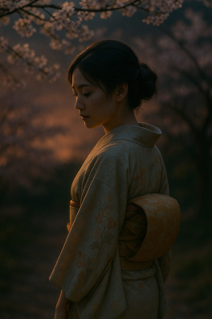 A photorealistic woman in traditional kimono standing under cherry blossoms at dusk, soft backlight, shallow depth of field, warm cinematic tone