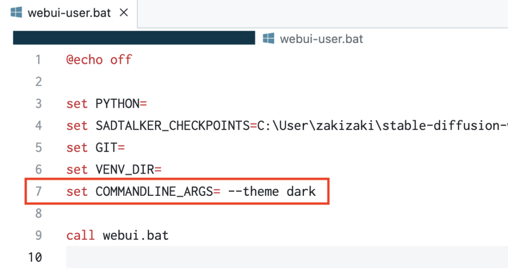 「webui-user.bat」に「ダークモード」でweb ui を開くようにコマンドを足します。