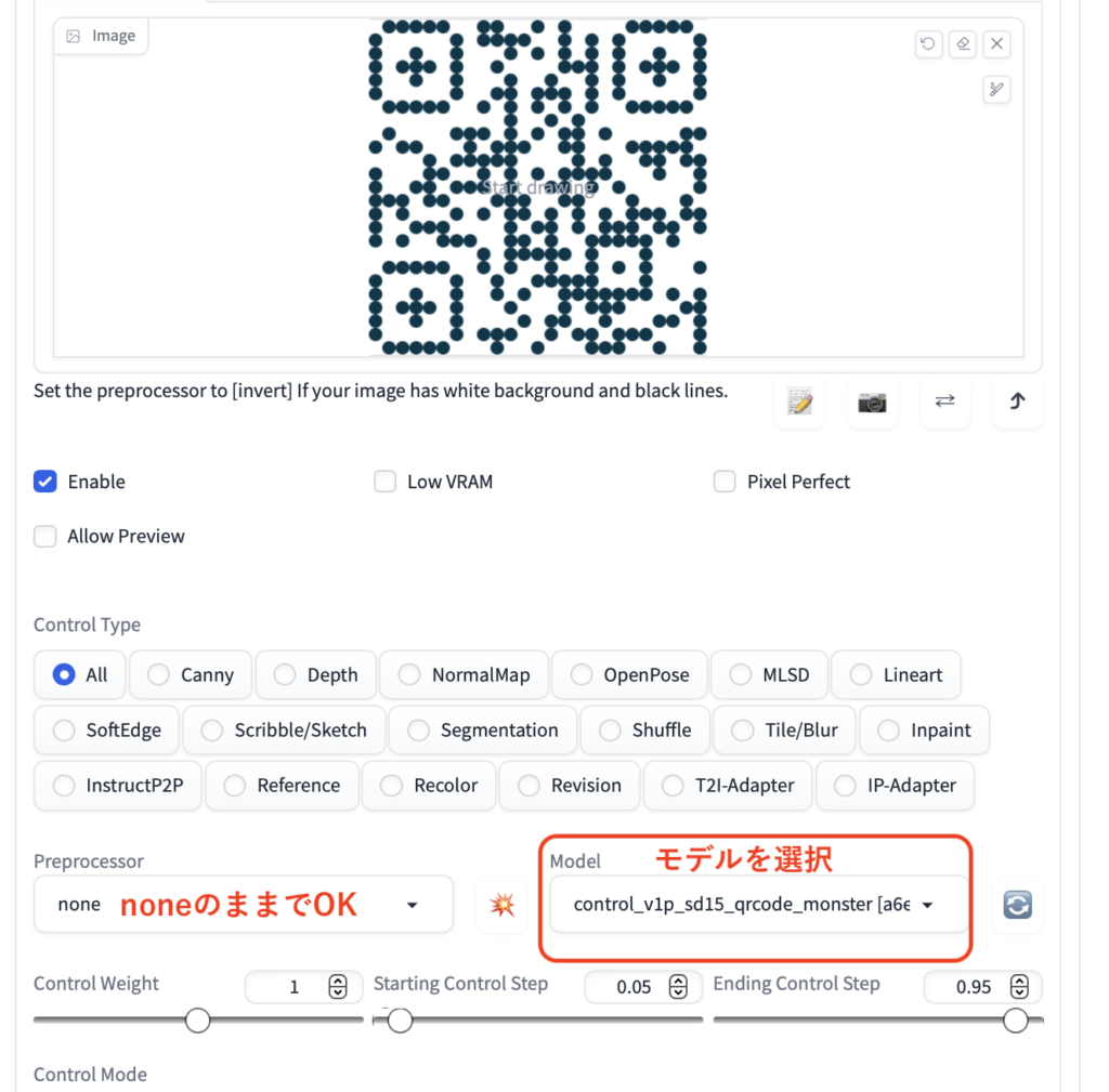 2、「Enable」を有効化し、Modelに先ほどダウンロードしたQRコード専用のControlNetモデルを選択
