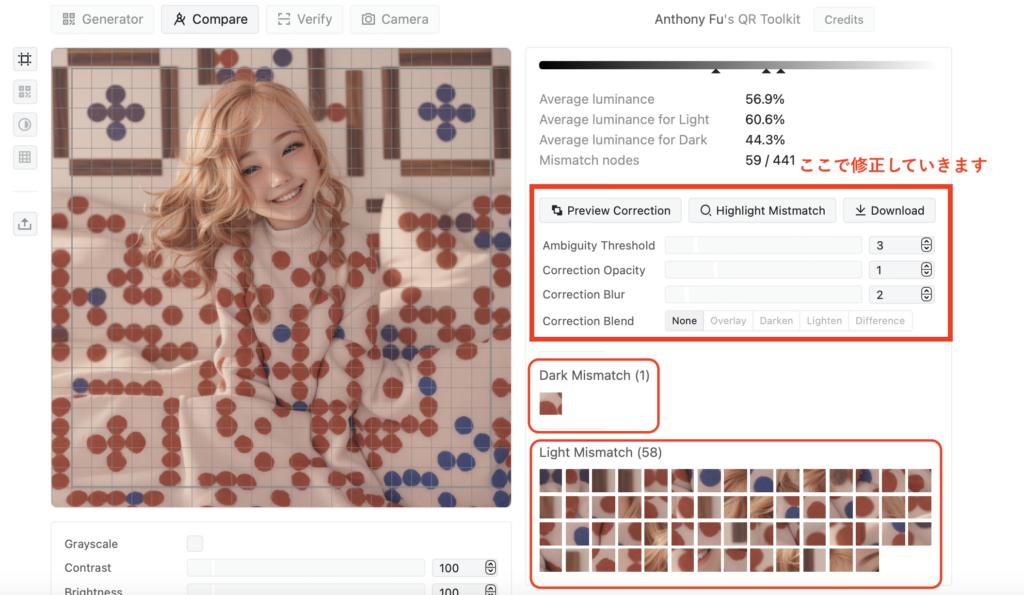 QRコードgenatater機能と画像とQRコードのアンマッチ箇所の検索、そしてある程度の修正までが行えるツールキッドがセットになっています。