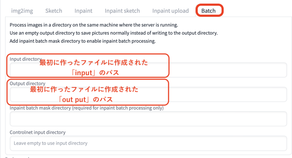 Input directory には②で作成したファイルの中に作成された「input」フォルダのパスを入れて下さい。