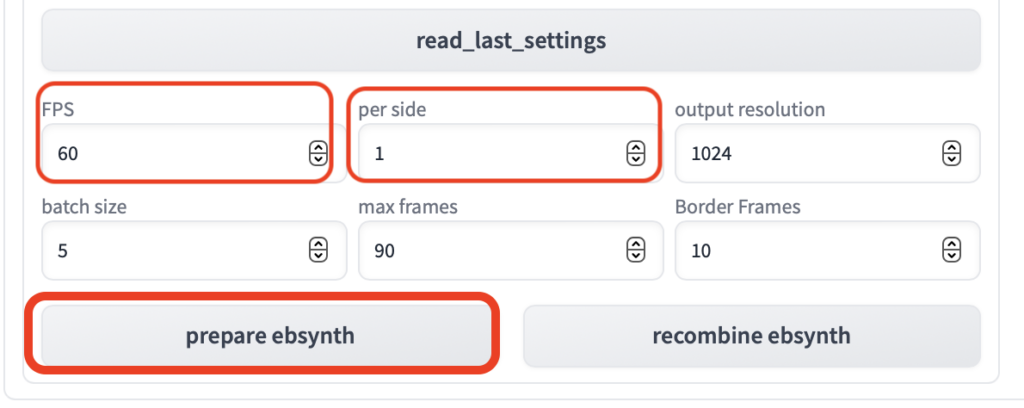 次に下のパラメーターの「FPS」「per side」を③前処理の工程で設定した物と同じに設定し、prepare ebsynthをクリックします。