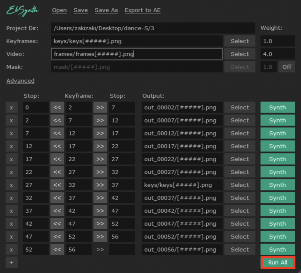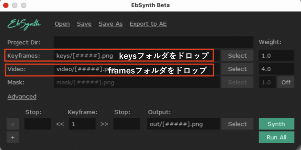 EbSynthを開いて、Keyframesに「keys」のファイルを、VIdeoに「frames」のフォルダをドロップします。